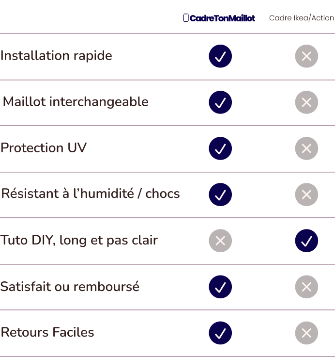 Conçu pour une installation rapide. Notre cadre sécurise votre maillot de la poussière et des chocs.