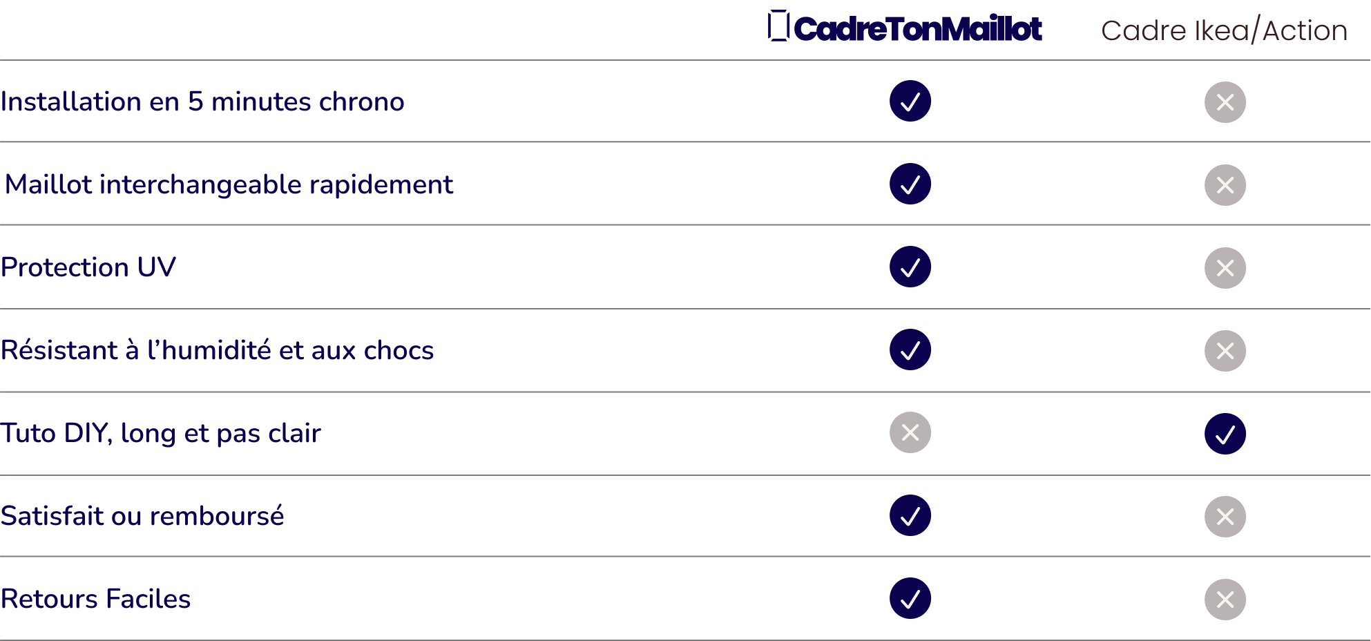 Fini la galère des cadres classiques ! Notre cadre est le seul spécifiquement conçu pour les maillots : ouvrez, placez, refermez.